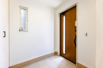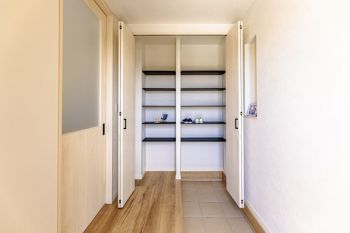 【シューズクローク】玄関にはシューズクロークを完備。家族分の靴をまとめて収納できるので、靴が散らからず、毎日の出入りもスムーズです♪お子様の通園・通学グッズや傘も収納できて便利です!